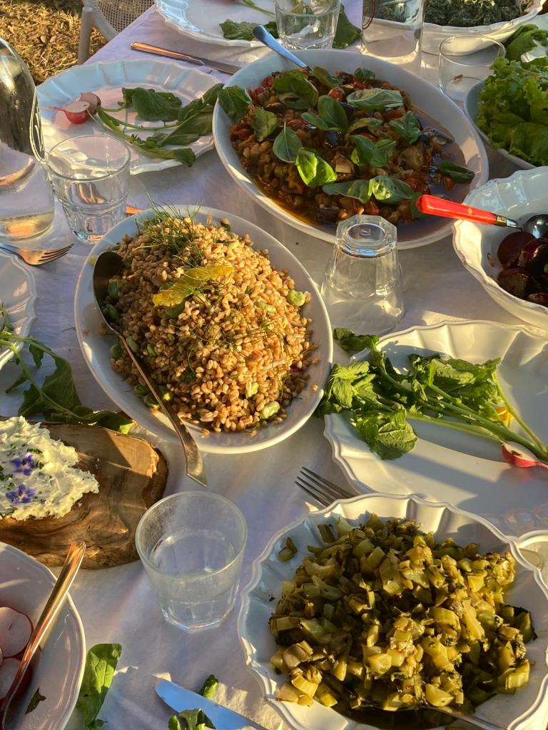 Spiced, honey roasted carrots with tahini cashew dressing. Herb, seed and arugula salad. Cabbage and sprout fritters with spicy labneh.